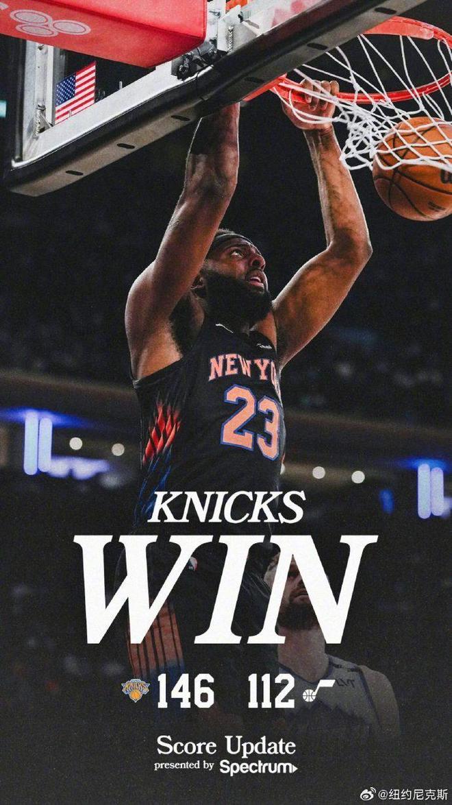 尼克斯全场最多时刻领先41分优势,末节比赛提前失去胜负悬念,尼克斯单节31-35被追回4分,最终尼克斯146-112轻松大胜爵士,进一步巩固东部第二。
